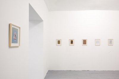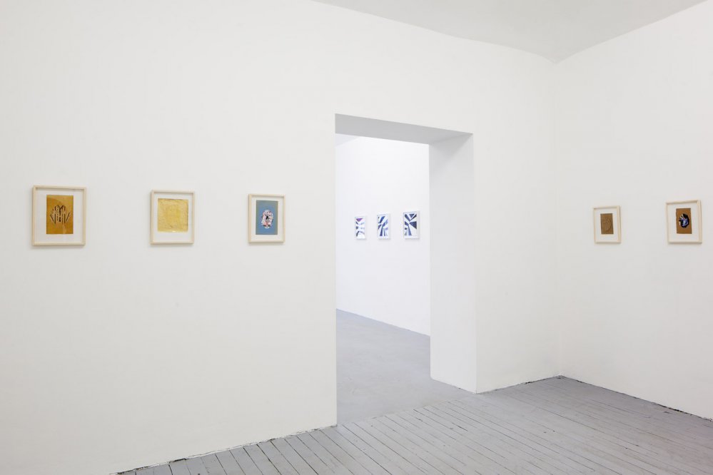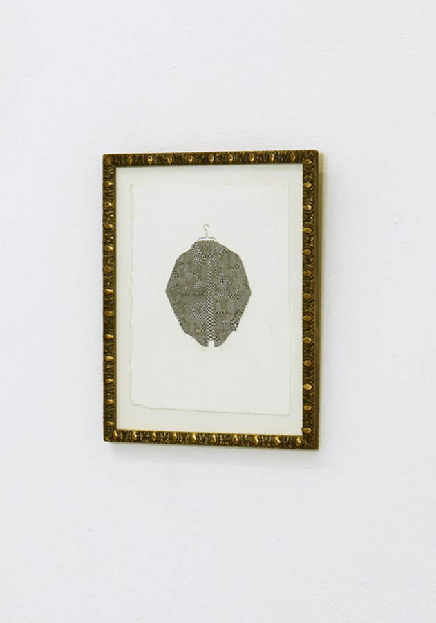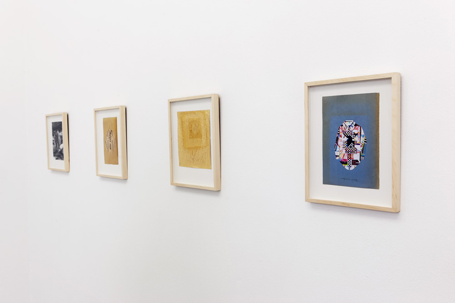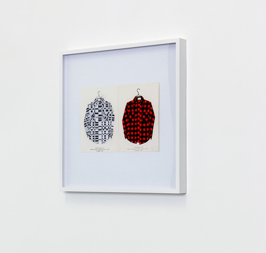 Nestjob’s shirt collages were initially inspired by George Schneeman (1934–2009) and Joe Brainard (1941–1994), who had both made drawings of plaid work shirts. Nestjob was attracted to the unpretentious simplicity and everyday poetic resonance of these images. His first shirt collage was made from cut up pieces of a reproduction of one of Chauhan’s erased album covers. Nestjob’s re-use of Chauhan’s work—itself dependent on found material—evokes the innovative frugality of a gleaner, a squatter, and a thrift-store shopper. As that first work evolved into a series, Nestjob explored a wide range of materials and effects, always preserving the image of a work shirt and maintaining an intimate, almost miniature scale. In many of the collages, the shirt blends into the background as if camouflaged. The modesty of the scale and the images’ virtual disappearance is balanced by a precision and radiance that recalls the marvelous flash of a Japanese noh robe.
