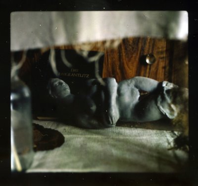 In another Still Life the curtain has risen over a lying female figure with folded arms, whose pudency is covered by a moth. The figure, a casting of Wilhelm Lehmbruck´s famous sculpture Die Sinnende from 1910/11 leans on a book-cover with the title Das ewige Antlitz. The book that was first published in 1926 again serves as a memento mori. It is a collection of photographic images of death masks from famous historical figures and personalities that also refers to a 100 minute film with the same title that Markus Selg just has finished.
