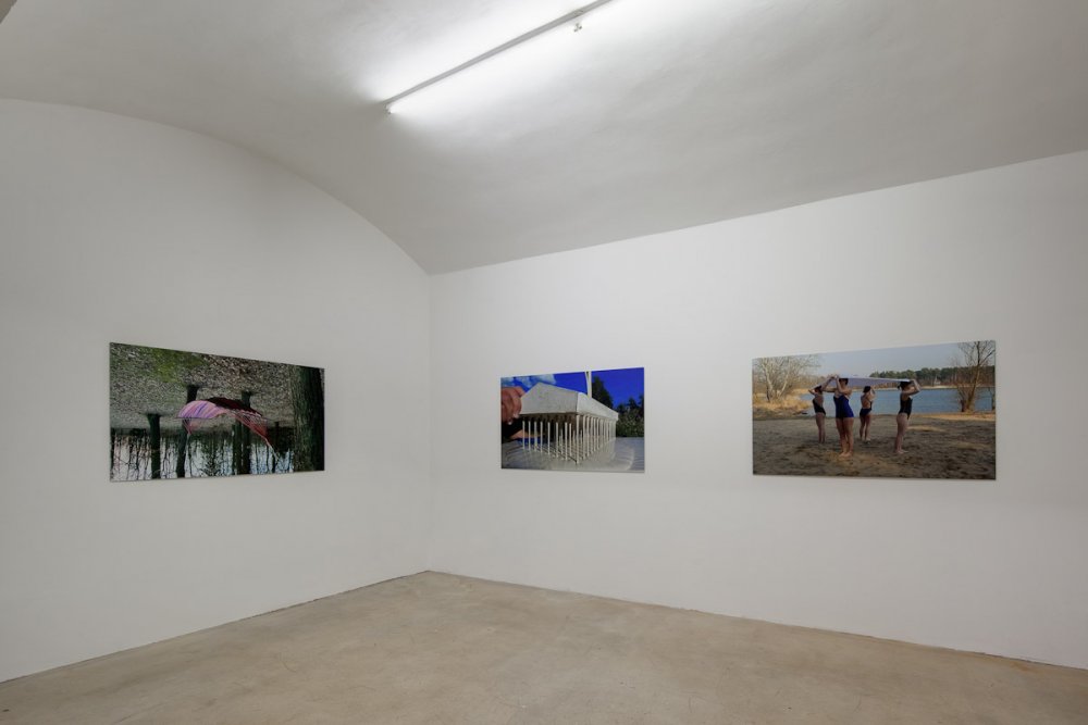 A series of three photographs “Antiquity” alludes to the ancient architecture. A fleeting image of an architectonic object emerges in depicted situations and becomes “architecture for the moment”: A swinging hammock upside down suggests an arch vault. White paint is poured through holes the placement of which corresponds to the arrangement of pillars in Athens' Parthenon. Women dressed lightly resemble Greek caryatids with a supporting function in architecture.