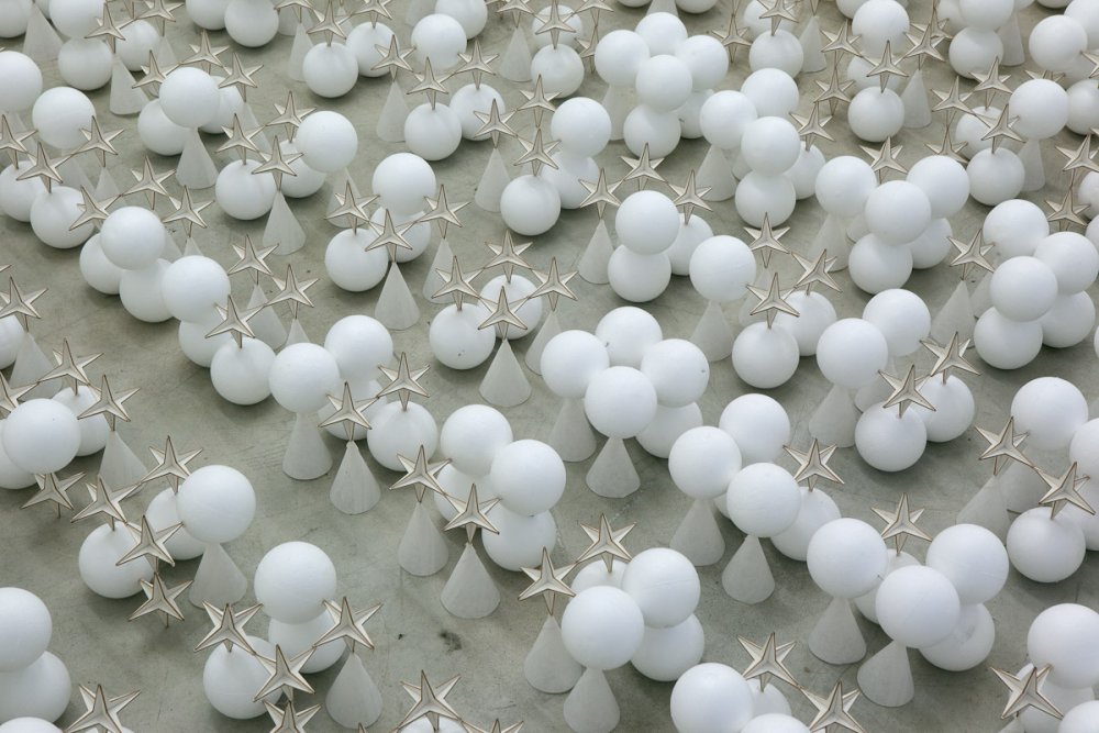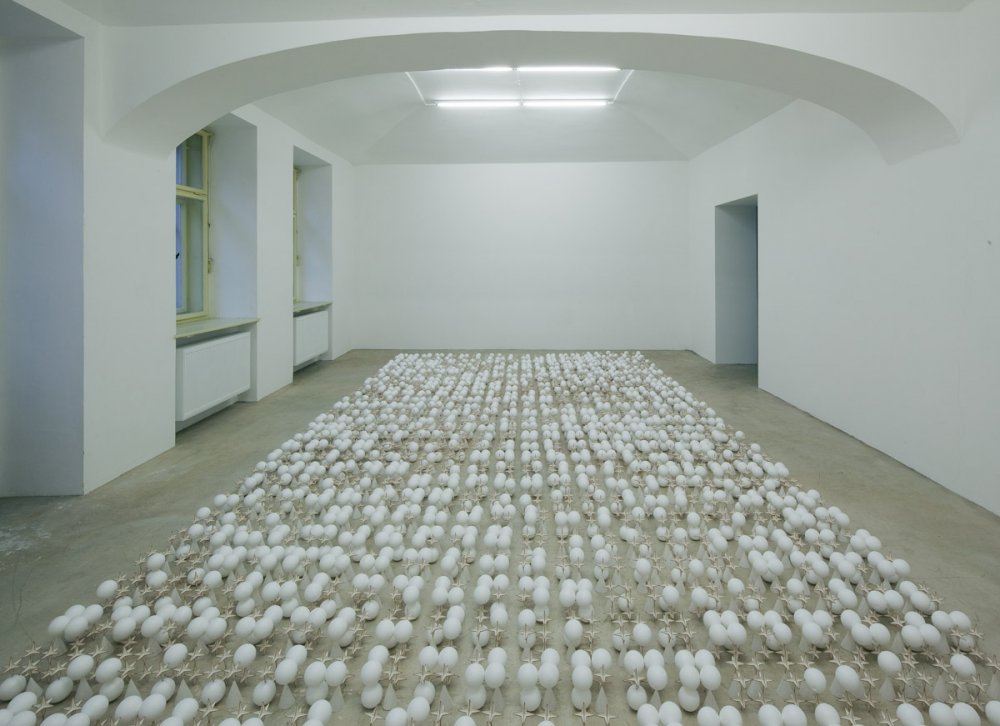“Mountains, Stars, and the Sun” installation contains 686 eight-part objects which represent all the possible ways of arrangement of three simple elements based on pre-given rules. Smetana works with objects as signs that are structured according to a simple principle. Based on this principle, each object becomes a „poetic“ model of a landscape (e.g., two mountains, four stars and two suns). Precision fails to be precise on purpose; instead, we are presented with “hand-drawn geometry” or “minimalism with a human face”.