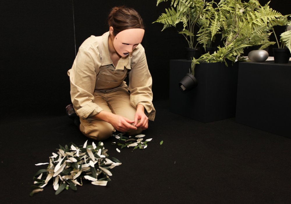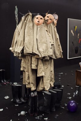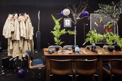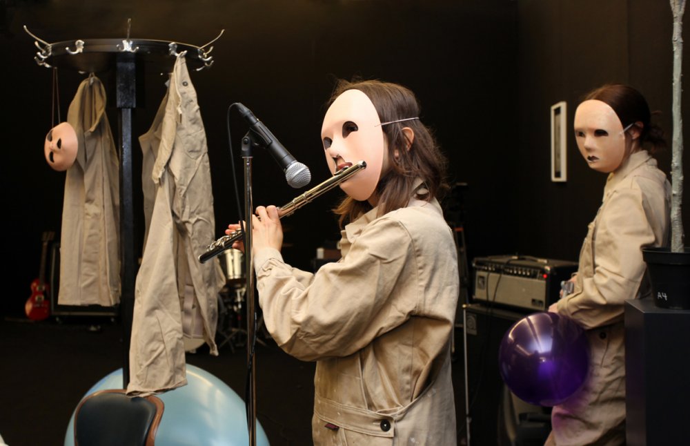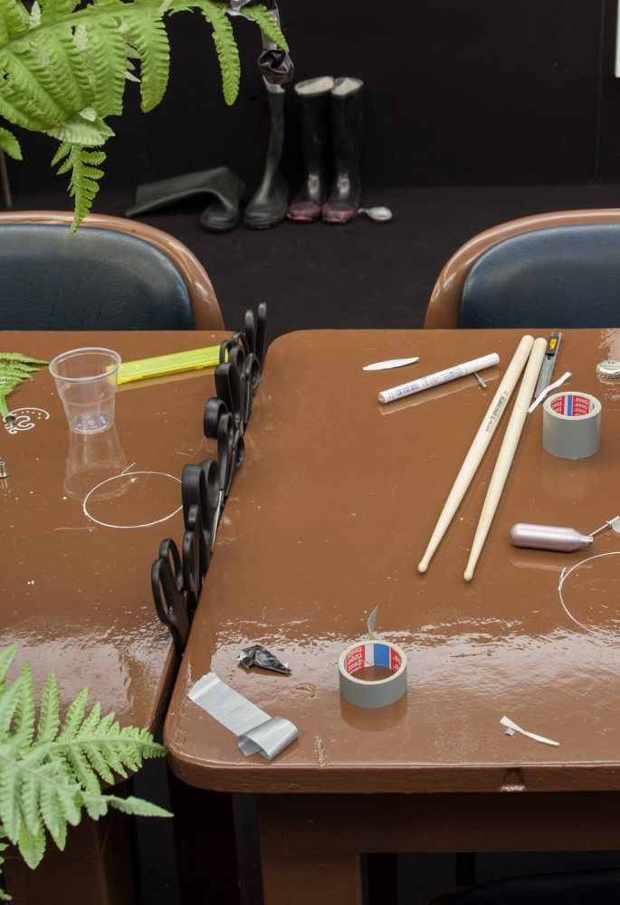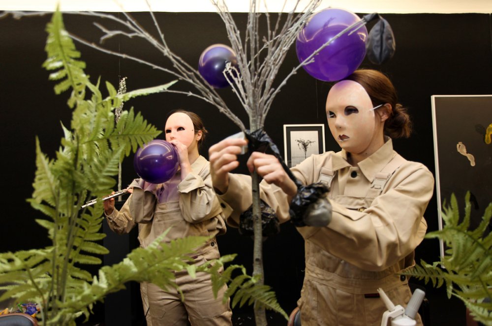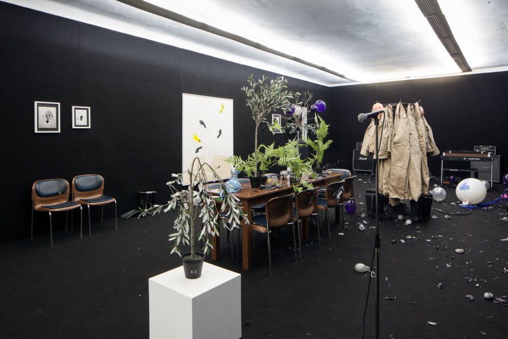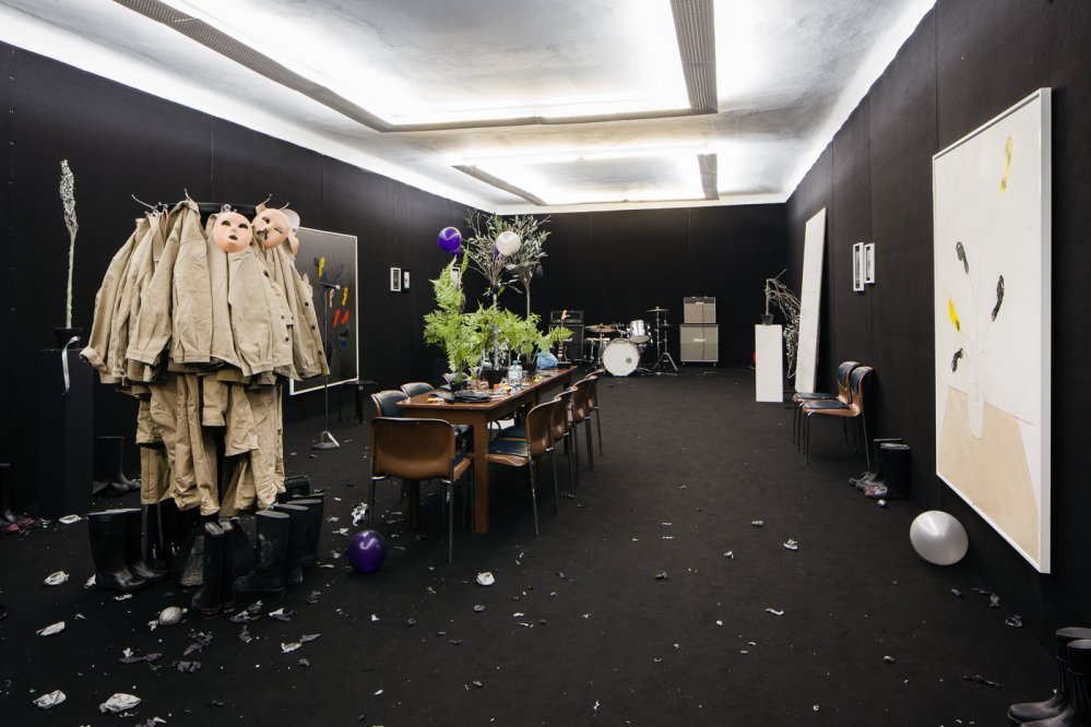 Thomas Zipp’s next step in this direction took place with the exhibition “The World`s Most Complete Congress of Ritalin Treatments“, which took place in 2012 in Innsbruck, Austria. While in Kassel, the visitors were able to move freely through the whole fictive clinic, whereas in Innsbruck, Zipp created a sort of functional laboratory for researching the processes taking place in the human subconscious. This latter installation was made up of furniture, chairs, various objects, a harmonium, microphones, and buckets with mud, creating a place for performances executed by students from local schools. Dressed in overalls and wearing white masks on their faces, these actors were performing a mysterious activity, similar to mystical theatre. The overalls and masks protected the anonymity of the participants of these experiments and enabled them to release their own feelings and thoughts all the way to the boundary, eliminating rational control.